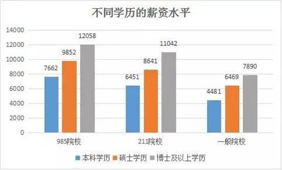 通過以上的數據可以看出:博士比碩士平均高2000元左右,碩士比本科平均高2000元左右;同時,985、211、一般高校的薪資也是有差距的,985高校起薪略高于211高校,平均差別為1000元左右,211高校和一般院校之間的差距平均在2000元左右。