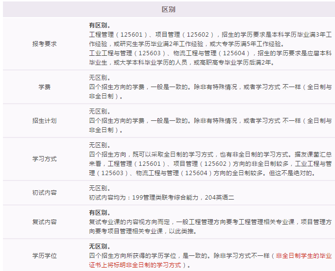 工程管理(125601)、項目管理(125602)、工業工程與管理(125603)、物流工程與管理(125604)
