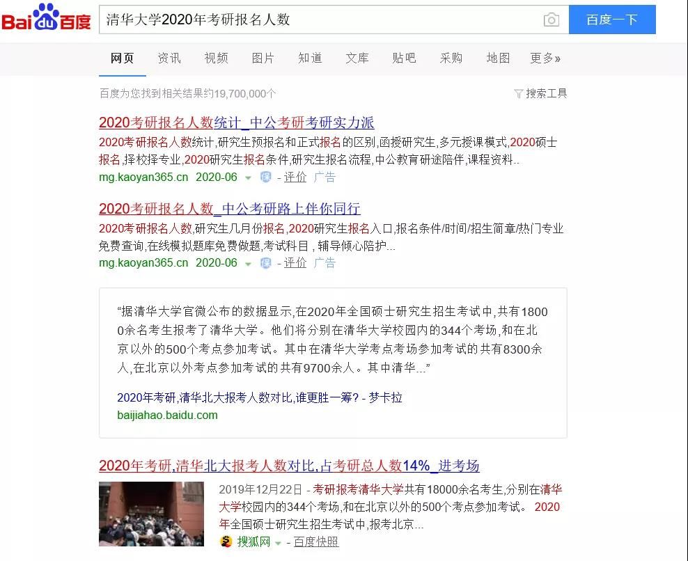 報考人數是一個比較關鍵的信息,從中可以看出你的競爭對手到底有多少。數據可以從官網查找或者直接在瀏覽器搜索:XX大學2020年考研報名人數,有的高校特別是名校熱門專業報考人數非常多,如果沒有足夠強大的實力建議不要報考,否則容易成為炮灰!