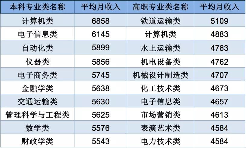 具體來說,計(jì)算機(jī)類、電子信息類、自動化類等本科專業(yè)畢業(yè)生薪資較高,2019屆平均月收入分別為6858元、6145元、5899元;鐵道運(yùn)輸類、計(jì)算機(jī)類、水上運(yùn)輸類等高職專業(yè)畢業(yè)生薪資較高,2019屆平均月收入分別為5109元、4883元、4763元。