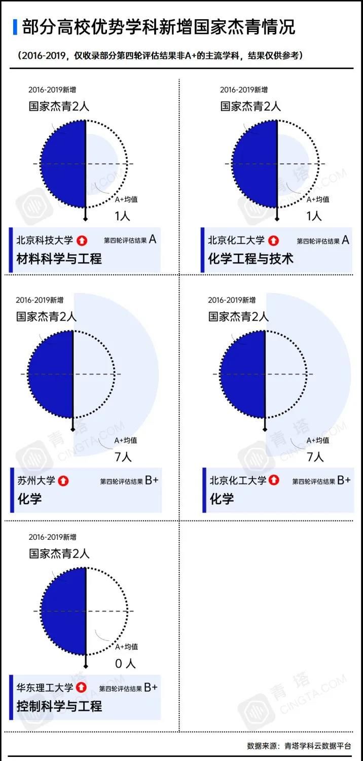 北京化工大學(xué)的化學(xué)工程與技術(shù),華東理工大學(xué)的控制科學(xué)與工程,北京科技大學(xué)的材料科學(xué)與工程均新增杰青2人,表現(xiàn)明顯優(yōu)于各學(xué)科中A+學(xué)科的均值。