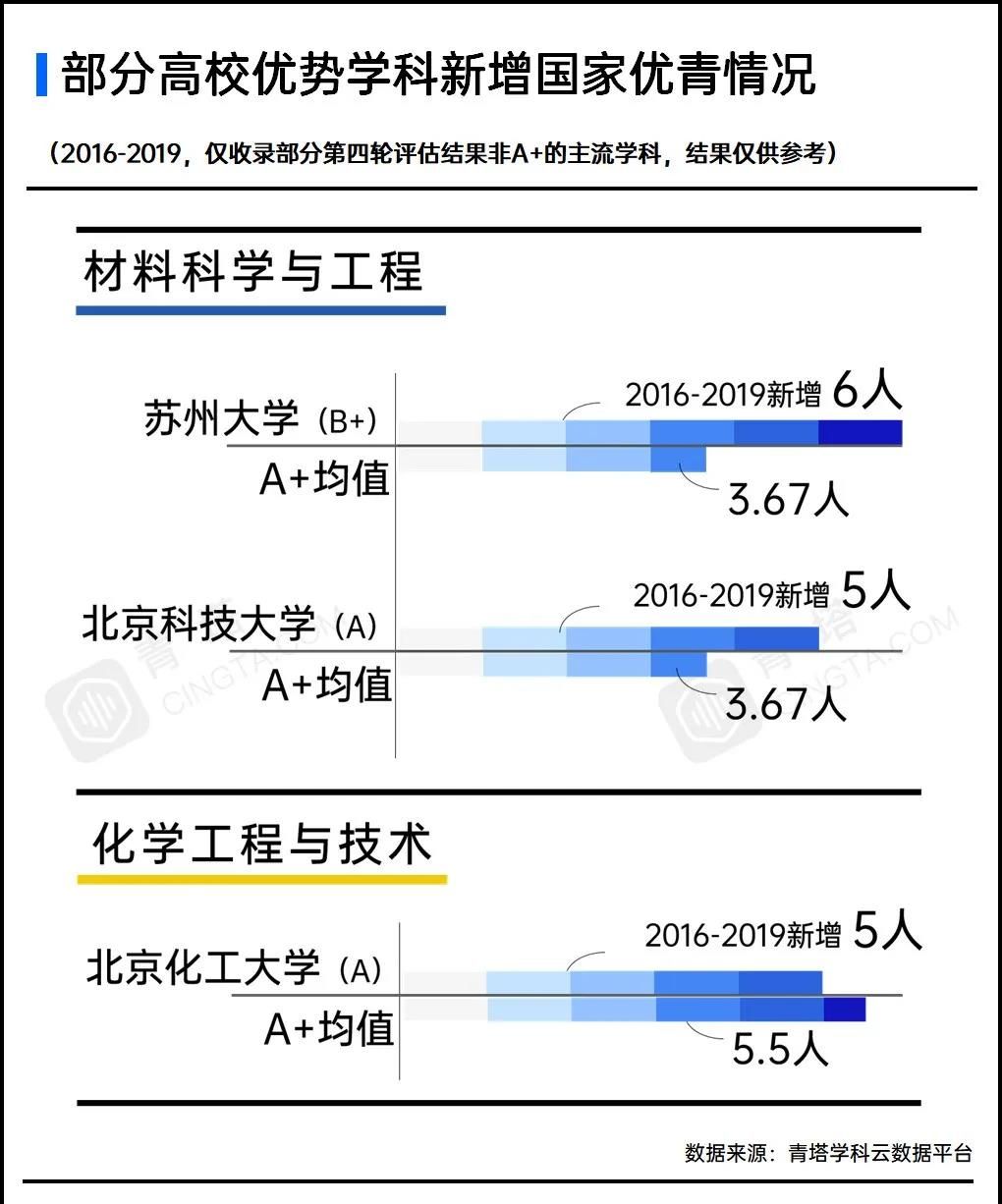 蘇州大學(xué)、北京科技大學(xué)的材料科學(xué)與工程學(xué)科新增優(yōu)青數(shù)量均在5人及以上,遠(yuǎn)遠(yuǎn)高于A+學(xué)科3.67人的均值;而北京化工大學(xué)的化學(xué)工程與技術(shù)學(xué)科新增優(yōu)青5人,完全擁有與A+學(xué)科一較高下的實(shí)力。