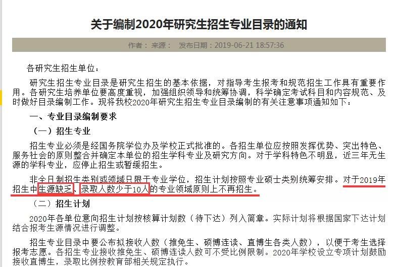 山東理工大學(xué)在關(guān)于“修訂2021年碩士研究生招生專業(yè)目錄的通知”公告中指出“原則上報考人數(shù)連續(xù)2年少于10人的考試科目不再列入招生專業(yè)目錄”。