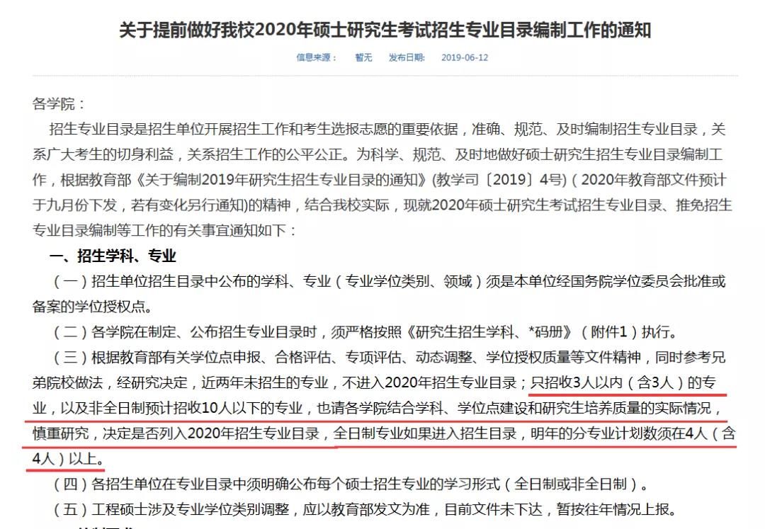 下面是福州大學(xué)20屆的相關(guān)招生公告,公告中明確表示僅招收3人以內(nèi)的全日制專業(yè)各學(xué)院要慎重考慮是否加入專業(yè)目錄,但如果加入專業(yè)目錄,第二年的計劃招生數(shù)必須在4人及以上。