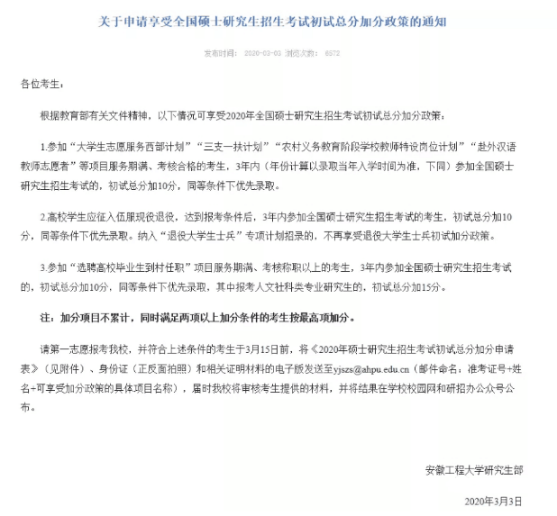 加分政策:參加“選聘高校畢業生到村任職”項目服務期滿、考核稱職以上的考生,3年內參加全國碩士研究生招生考試的,初試總分加10分。