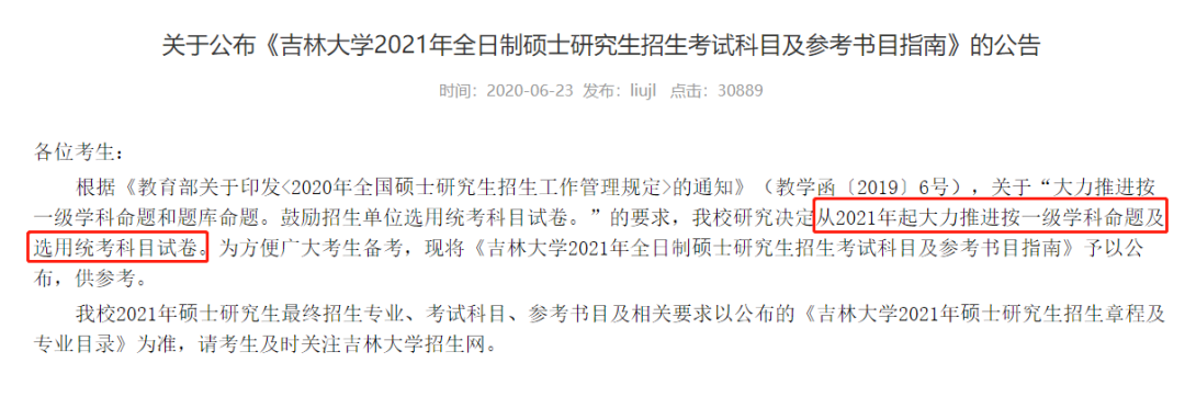 吉林大學從2021年起大力推進按一級學科命題及選用統考科目試卷。