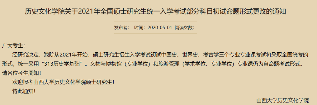 “我院從2021年開始,碩士研究生招生入學考試初試中國史、世界史、考古學三個專業專業課考試將采取全國統考的形式,統一采用“313歷史學基礎”。”