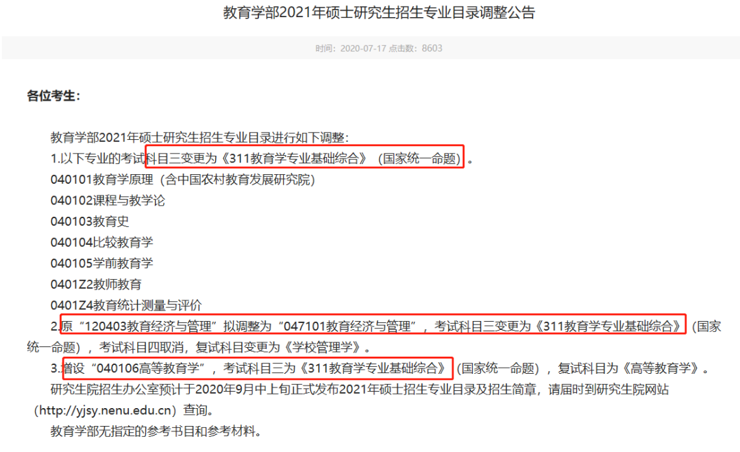 2.原“120403教育經濟與管理”擬調整為“047101教育經濟與管理”,考試科目三變更為《311教育學專業基礎綜合》(國家統一命題),考試科目四取消,復試科目變更為《學校管理學》。
