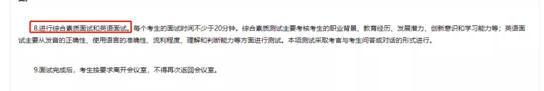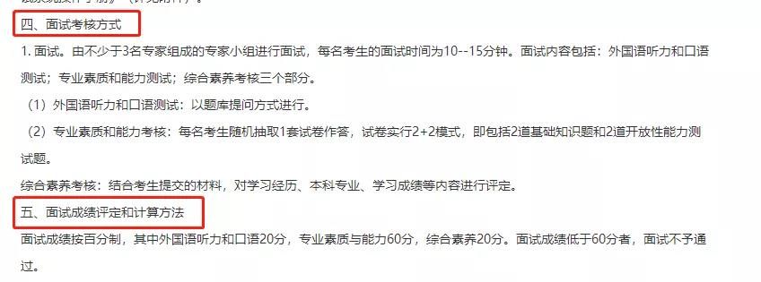 同時,面試成績按百分制,其中外國語聽力和口語20分,專業素質與能力60分,綜合素養20分。面試成績低于60分者,面試不予通過。