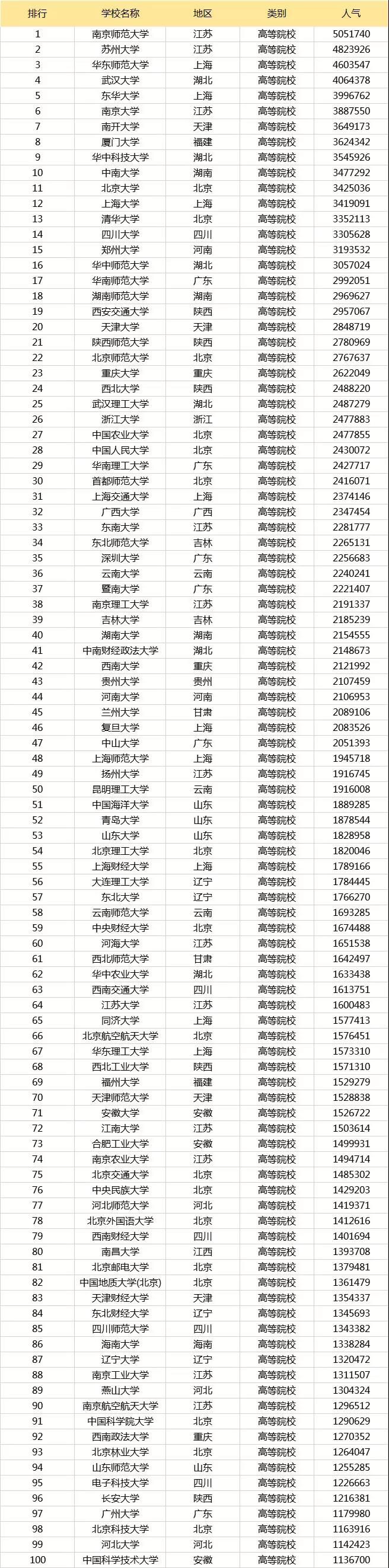 在開始討論之前,大家可以先看一下2020年考研人氣研究生院校前100名都有哪些學校吧。