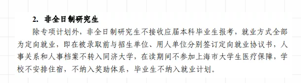 除專項計劃外,非全日制研究生不接收應屆本科畢業生報考,就業方式全部為定向就業,即在被錄取前與招生單位、用人單位分別簽訂定向就業協議書,人事關系和人事檔案不轉入同濟大學。